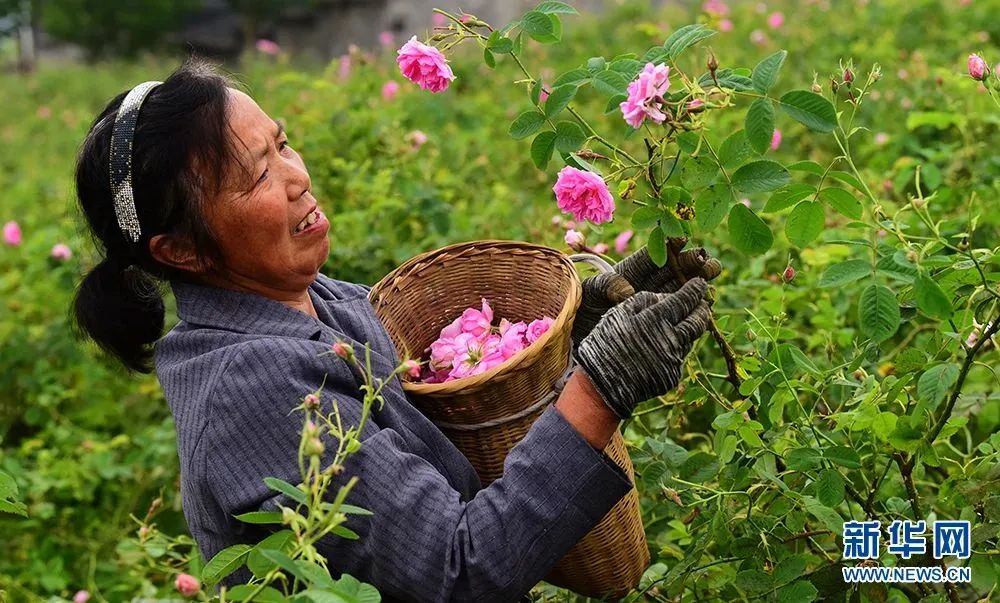 五龍坪村村民采摘玫瑰花。新華網發 李維君攝